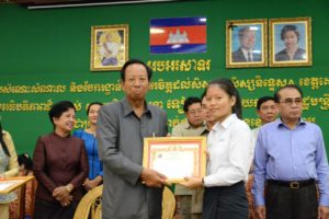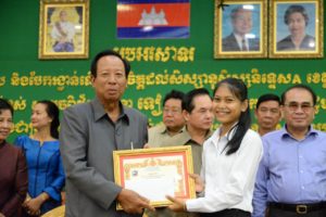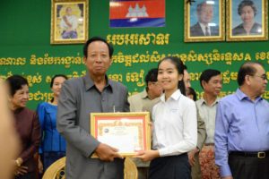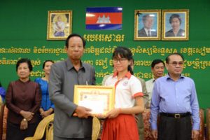 ខេត្តសៀមរាប ៖ សិស្សដែលជាបេក្ខជនប្រឡងសញ្ញាប័ត្រមធ្យមសិក្សាទុតិយកភូមិ ឆ្នាំសិក្សា២០១៦.២០១៧ ទទួលបាន លទ្ធផលនិទ្ទេស A ចំនួន ៤៧នាក់ ស្រី២២នាក់ នៅមណ្ឌលសៀមរាប ត្រូវបានទទួលរង្វាន់លើកទឹកចិត្ត ម្នាក់ៗ ម៉ូតូ១គ្រឿង និង សាំង៥០លីត្រ ថវិកា ១០ម៉ឺនរៀល ប័ណ្ណចូកញ៉ាំអាហារនៅភោជនីយដ្ឋានជប៉ុន ១សន្លឹក មួកសុវត្ថិ ភាព១ ស្លាកលេខម៉ូត និង លិខិតសរសើរ ពីសម្តេចពិជ័យសេនា ទៀ បាញ់ ឧបនាយករដ្ឋមន្ត្រី រដ្ឋមន្ត្រីក្រសួងការពារជាតិ និង ជាប្រធានក្រុមការងារថ្នាក់ជាតិ ចុះជួយខេត្តសៀមរាប ត្រូវបានធ្វើការប្រគល់ជូនកាលពីចុងសប្តាហ៍ថ្ងៃអាទិត្យទី ១៧ ខែកញ្ញា ឆ្នាំ២០១៧ នៅរដ្ឋបាលសាលាខេត្តសៀមរាប ។