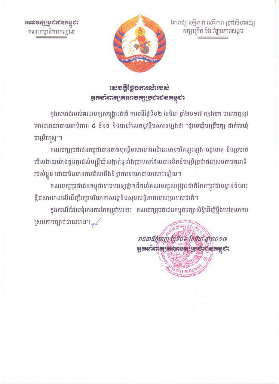 អ្នកនាំពាក្យគណបក្សប្រជាជនកម្ពុជាបានចេញសេចក្តីថ្លែងការណ៍មួយ Posted on ថ្ងៃចន្ទ, 6 ខែមីនា, 2017ថ្ងៃចន្ទ, 6 ខែមីនា, 2017